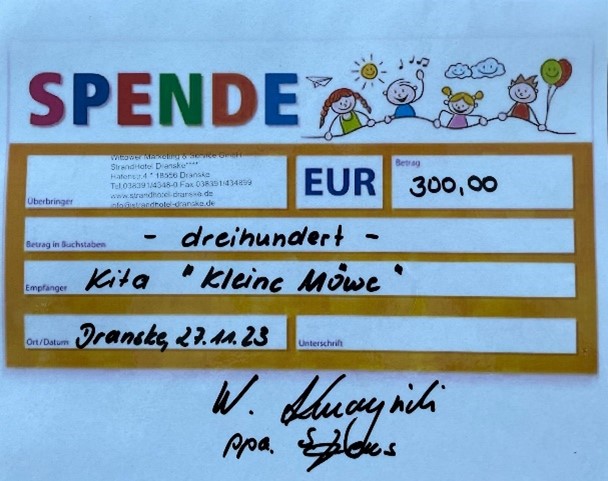 Auch die Kinder der Kita „Kleine Möwe“ in Dranske, hatten in diesem Jahr wieder die Möglichkeit, den Weihnachtsbaum im „Strandhotel Dranske“ zu schmücken, was auch sie, voller Freude am 28.11.2023 taten. Mit vielen Herzen, Engeln und Sternen dekoriert, erstrahlt der Weihnachtsbaum nun im Foyer des Strandhotels. Als Dankeschön für ihren Einsatz, gab es für die Kinder Lebkuchen, Kakao und Schoko-Weihnachtsmänner. Aber das sollte es nicht gewesen sein. Besonders groß war auch bei den Erzieherinnen die Freude über einen Spendenscheck von 300,00 €, welche sie vom Strandhotel Dranske überreicht bekamen.