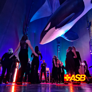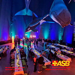 Der Abend begann mit einem Sektempfang im Foyer des Ozeaneums, wo das Catering von „Die Ausreißer“ bereits appetitlich angerichtet war. Anschließend betraten die Gäste den Saal, über dem beeindruckende Wal-Modelle schwebten. Die Tische waren mit besonderer Weihnachtsdeko geschmückt und die Lichterketten verbreiteten eine gemütliche Atmosphäre.