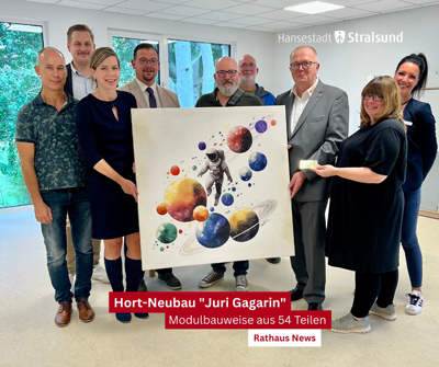 Am 28.08.2025 wurde das neue Hortgebäude von der Hansestadt Stralsund, vertretend durch die Amtsleiterin für Schule und Sport, Frau Dr. Sonja Gelinek, an unseren Geschäftsführer, Herrn Jens Brauer und Einrichtungsleiterin Nicole Schwebke, übergeben.